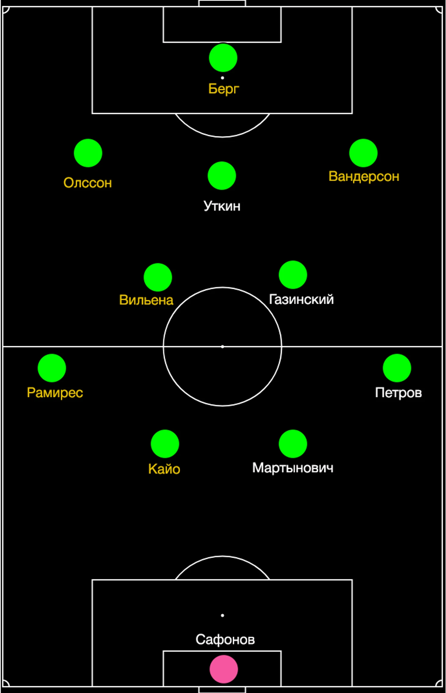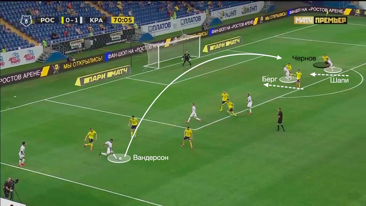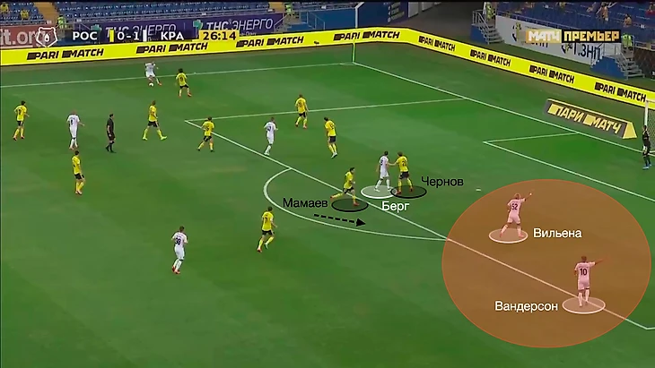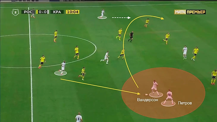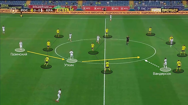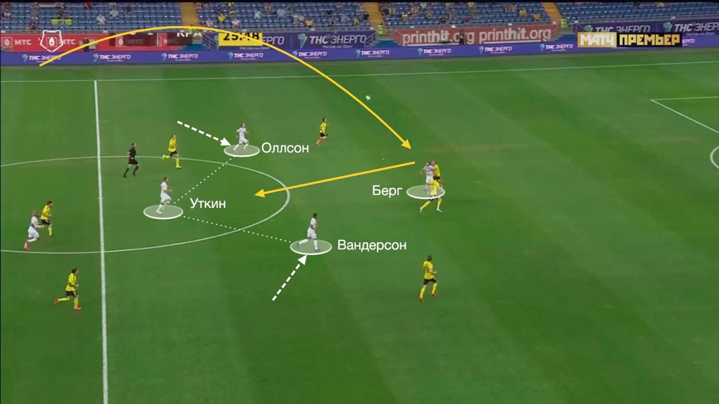 Очень узкие 4-3-3, при этом Уткин свободно получает мяч между линий в центре и находит передачей Вандерсона.