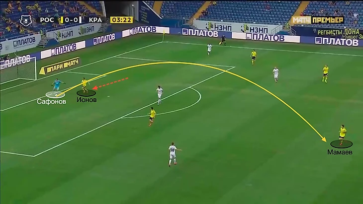 Ионов действительно хорошо поддавил вратаря «быков» и тот спешно вынес мяч точно на бывшего одноклубника Павла Мамаева. Однако к чему-то острому этот перехват не привёл.