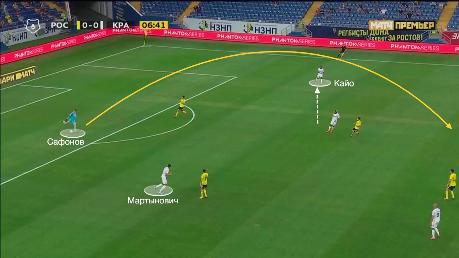 Его партнёры также не подстраивались под короткий розыгрыш после паса назад. Особенно это было заметно по действиям Мартыновича. Кайо зачастую уходил в ширину.
