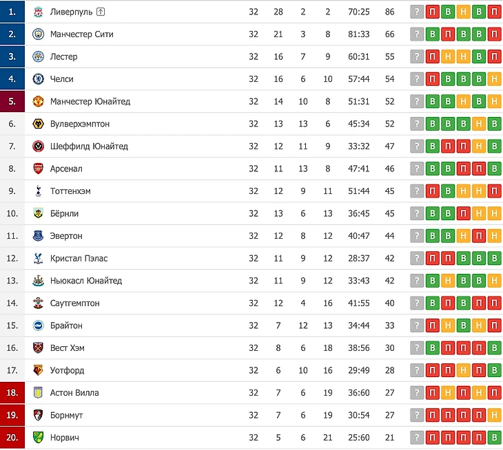 Добрый день, дорогие друзья! Денек отдохнули, и вот АПЛ снова возвращается! Вновь напряженная борьба за путевки в Европу и выживание, ура! А «Ливерпуль», кстати, крупно проиграл «Сити» – слишком долго праздновали? Или же 4:0 – знак того, что следующего чемпионства «Ливерпулю» ждать 40 лет? Ладно, долой глупые шутки про «мерсисайдцев», они все-таки заслужили уважения в этом сезоне и действительно чемпионы. Давайте посмотрим на турнирную таблицу: