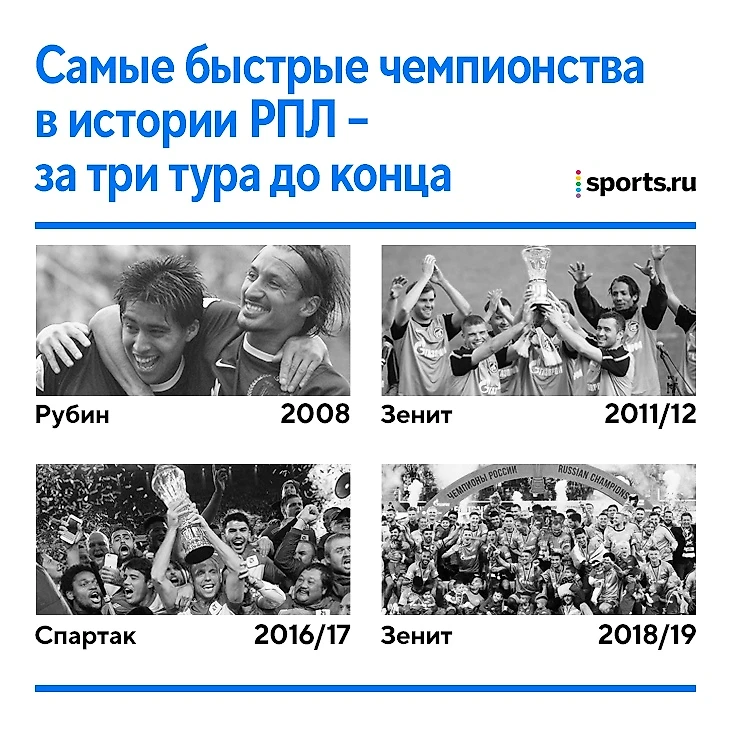 «Зенит» по два раза оформлял титул за три матча (сезоны-2011/12 и 2018/19) и два (сезоны-2010 и 2014/15) до конца сезона, а также выгрызал чемпионство у «Спартака» в 2007-м благодаря вознесению святого Домингеса в последнем туре.