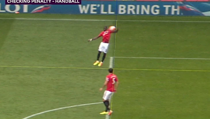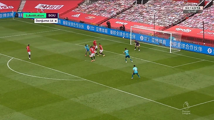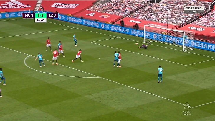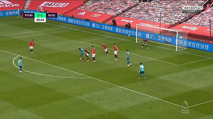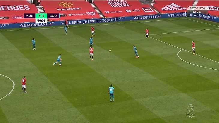 Мяч вновь у «МЮ». Байи может отдать на Магуайра, но пасует Матичу, на которого бегут двое соперников; еще двое закрывают возможные передачи.