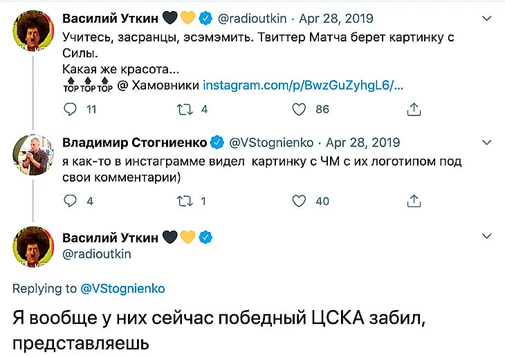 А потом добавил на ютюбе: «ЦСКА – «Краснодар» – это особая история, и не только потому, что победный мяч забил Даниил Уткин. Все написали: «Василий, он вам даже не однофамилец. У него фамилия птичья, а у вас – медицинская».