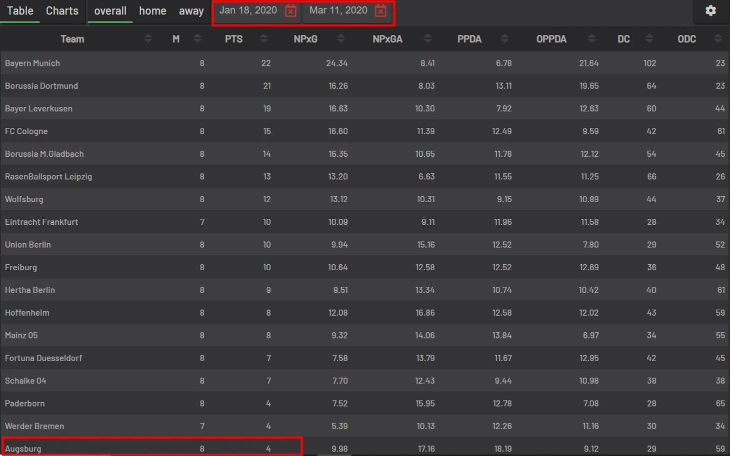 Но потом случился новогодний перерыв, и в период от января до короновируса "Аугсбург" показал абсолютно противоположный результат: 4 очка в 16 матчах - последнее место в таблице.