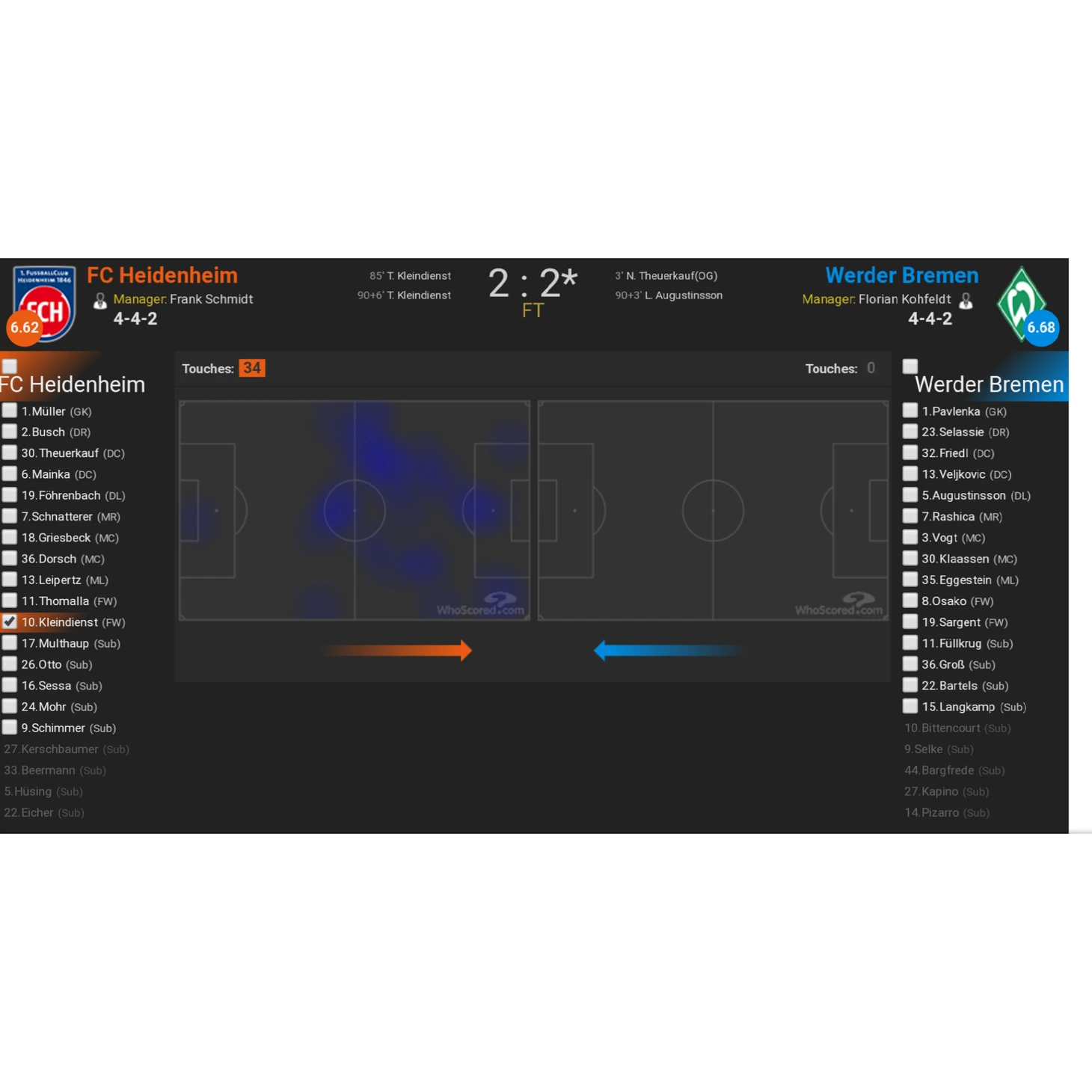 Ответная встреча началась по худшему сценарию для Хайденхайма. Уже на минуте 3 матча игрок хозяев поразил собственные ворота. После этого им уже было нечего терять и Хайденхайм начал играть смело. Вратарь вводил мяч в игру через центральных защитников и опорников не боясь ошибиться. Регулярно команда пыталась атаковать через центр, но у них в этом случае ничего не выходило. Форвард команды также пытался помочь играя в оттяжке что видно по его тепловой карте, но обычно он просто терял мяч потому как был неспособен начать атаку или в худшем случае обрезал своих партнеров.