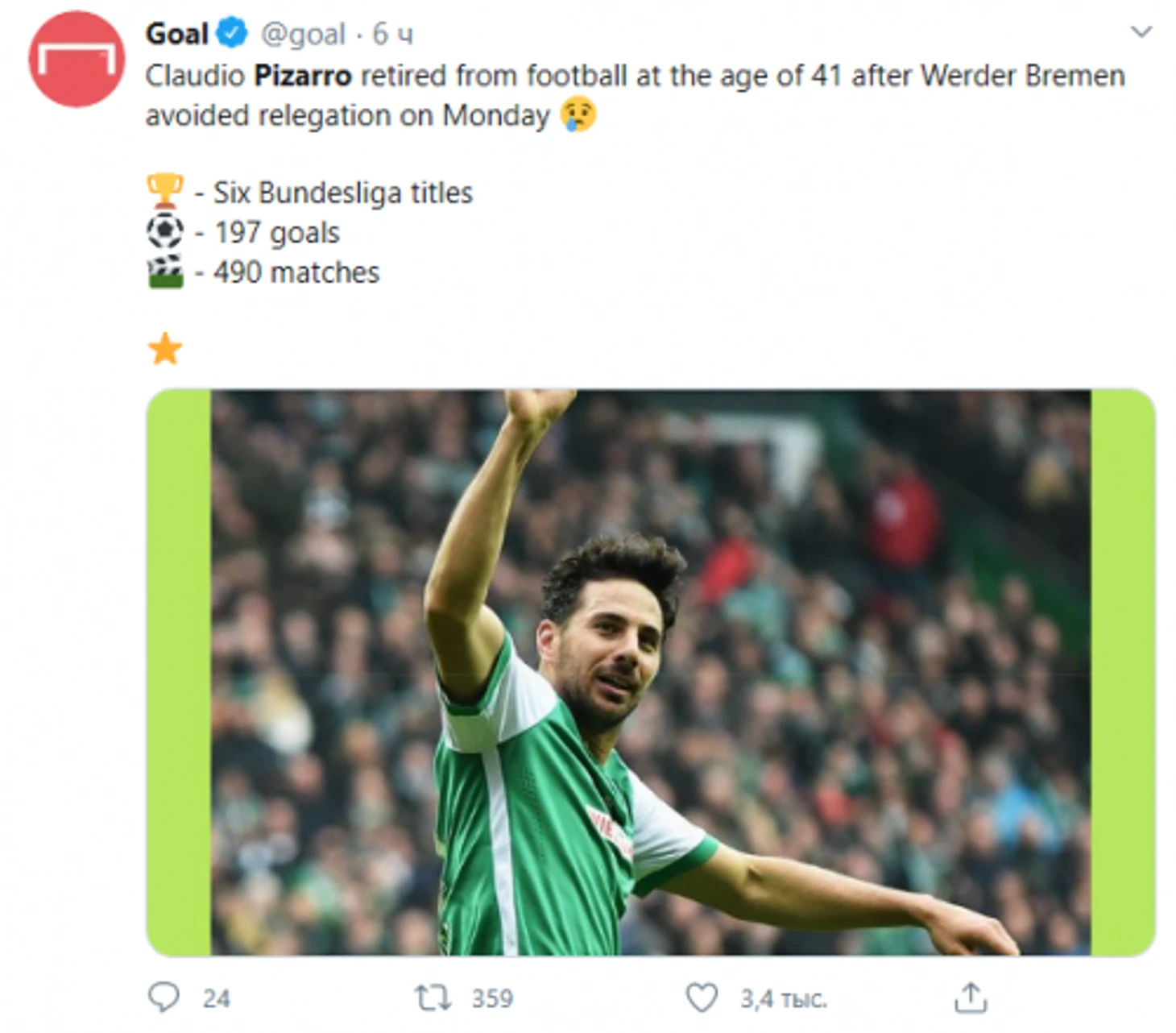 Клаудио Писарро ушел из футбола в возрасте 41 года после того, как Вердер Бремен избежал понижения в понедельник