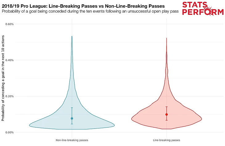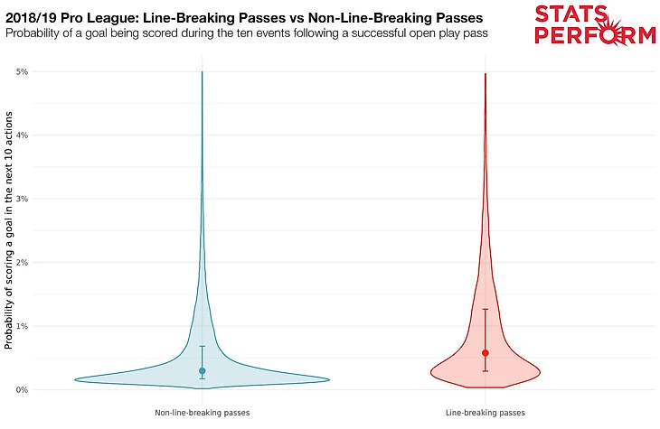 Хоть в этом подходе и отсутствует статистическая строгость, он указывает на то, что передачи в пространство между линиями повышают вероятность гола, а медианное значение почти в два раза выше, чем у непроникающих передач.