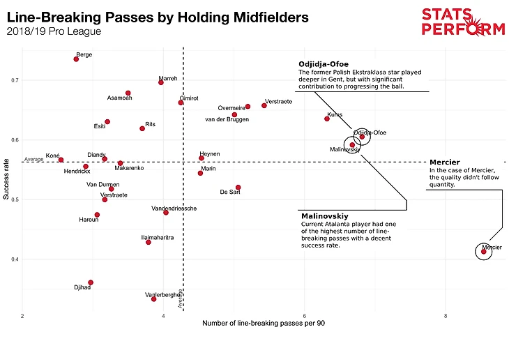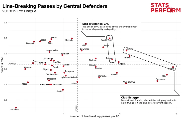 Диаграмма ниже описывает всех игроков, сыгравших центральным защитником минимум десять игр в сезоне 2018/19 по двум показателям: количество попыток передач между линиями и процент их успешности.