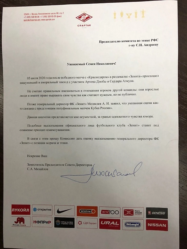 Правда, никакой юридической силы письмо пока не имеет. По регламенту, комитет РФС по этике правомочен проводить заседание только в случае поступления письменного обращения от: