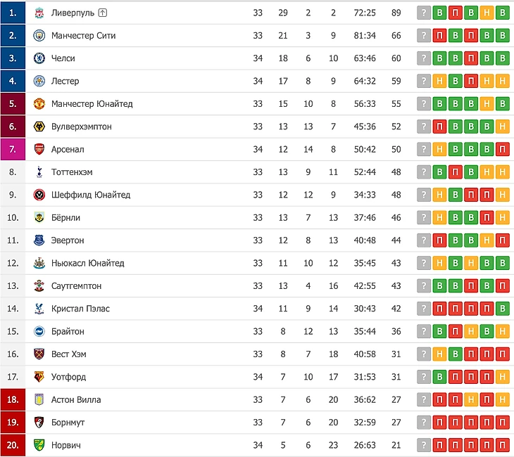 Добрый день, дорогие подписчики! 34-й тур АПЛ начался за здравие: «Кристал Пэлас» и «Челси» устроили настоящее шоу, «синие» одержали победу 2:3 благодаря спасению легенды Зуминатора на последних секундах матча, «Уотфорд» обыграл «Норвич» и увеличил шансы на спасение, а защита-бетон «Арсенала» пропустила таки мяч в последнюю десятиминутку от «Лестера» – в 14302579489 раз отличился амбассадор энергетиков на футбольном поле Джейми Варди, возглавив гонку бомбардиров. Из-за ничьи с «канонирами» «Лестер» пропустил вперед «Челси». Давайте взглянем на турнирную таблицу: