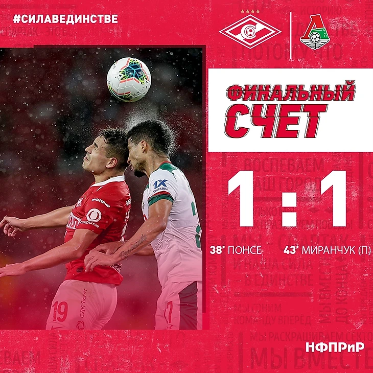 Счет в матче на 38-й минуте открыл Эсекьель Понсе, а в роли ассистента выступил Айртон Лукас. «Локомотив» отыгрался еще до перерыва. На 43-й минуте в ворота «Спартака» был назначен пенальти, который реализовал Алексей Миранчук.
