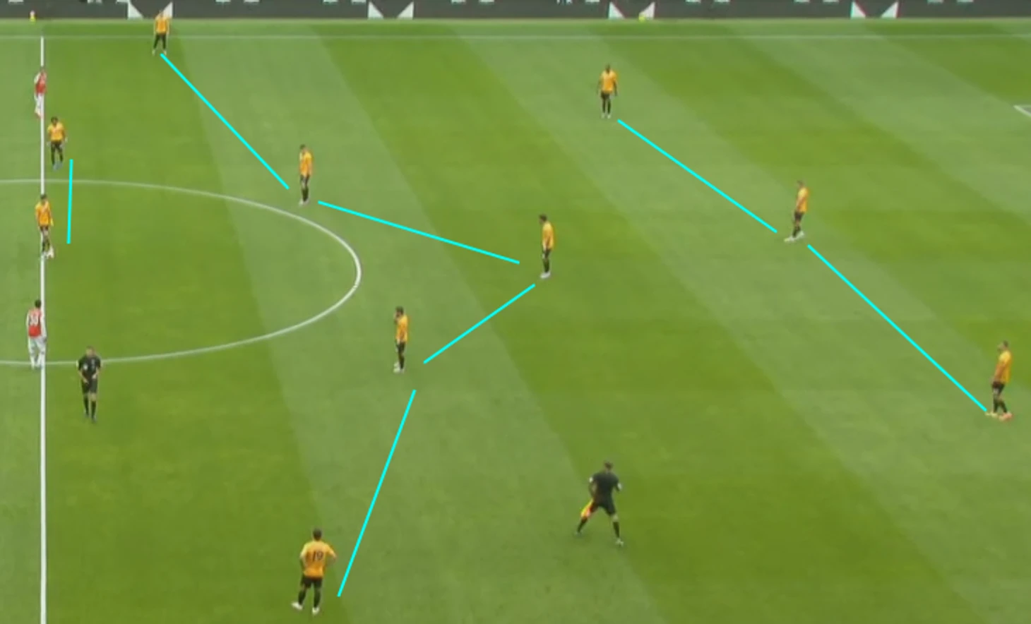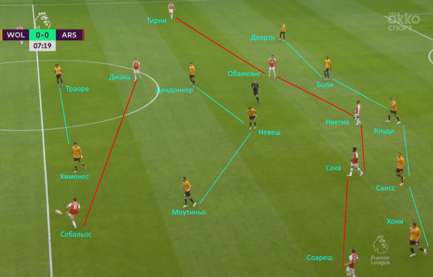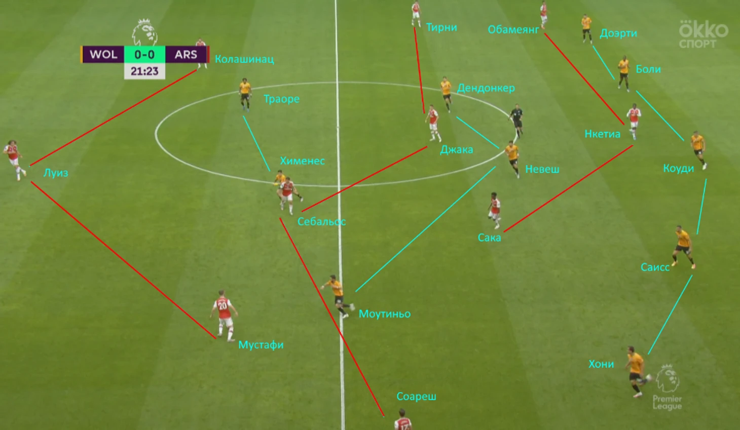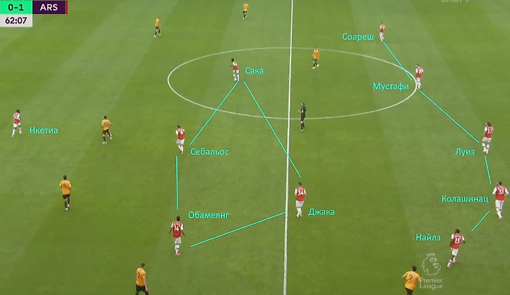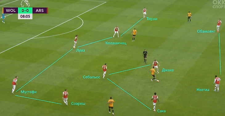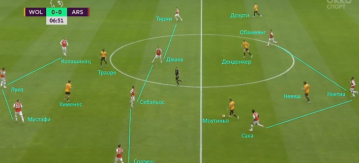 Самый лучший пример, идеальный общий план – «Арсенал» атакует, а «волки» в обороне в формации 5-3-2.