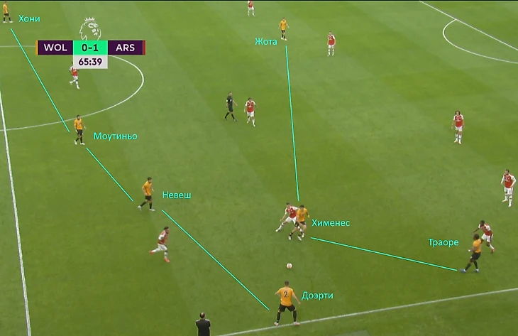 По точно такой же схеме действовали фланговые игроки «Вулверхэмптона»: Хони и Доэрти оказывались в линии обороны.