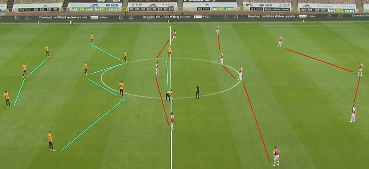 На 55-ой минуте Нуну Эшпириту Санту проводит замену: центральный полузащитник Леандер Дендонкер уступает место на поле левому вингеру Диогу Жота. С этого момента «Вулверхэмпотон» перестраивается на 3-4-3: Траоре уходит на правый фланг атаки, Жота на левый, а Хименес играет центрального нападающего. Тройка защитников остается, Хони и Доэрти по-прежнему играют по всей ширине.
