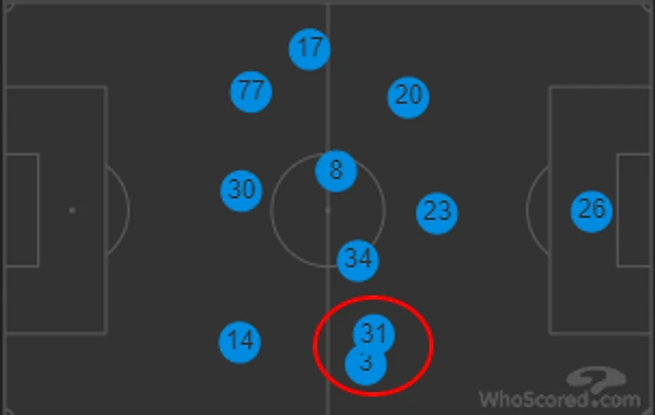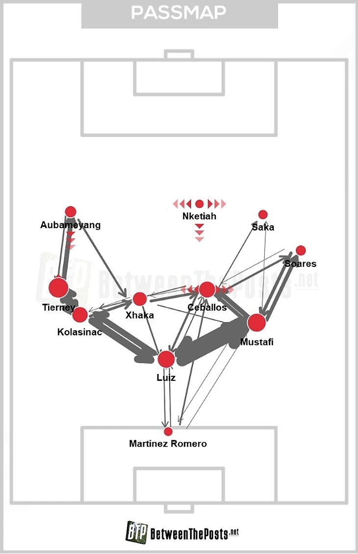 В центре поля у «Арсенала» образовался своеобразный ромб – Луиз, Колашинац, Мустафи, Себальос и Джака. Тирни всё время был слишком близко к Колашинацу, для того чтобы вдвоём сдерживать Траоре, и держать ширину на фланге приходилось Обамеянгу. Это подтверждает и whoscored.com, карта позиций игроков.