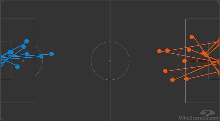 Больше всех передач выполнили Мустафи и Луиз(68 и 67 пасов соответственно). Бразилец хорошо выполнял забросы – 8 дальних передач(6 точных). У Колашинаца чуть меньше передач, 53.