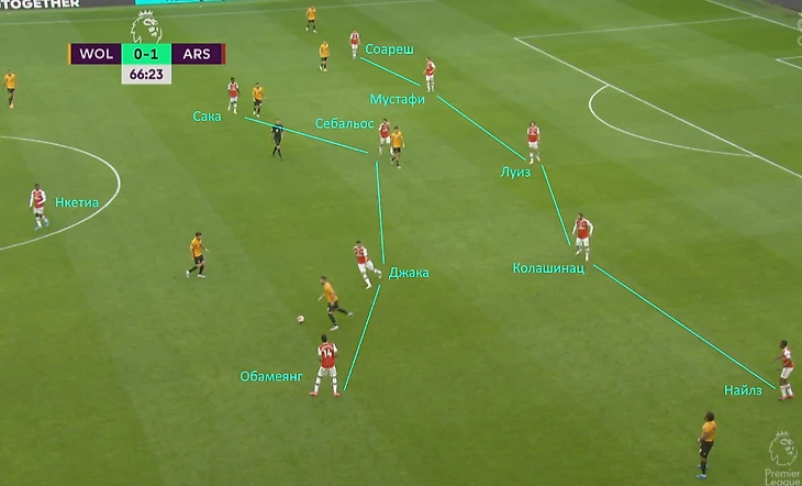 Всё это время «Арсенал» проводит в обороне, отдав мяч сопернику. Артета реагирует на замену и перестроение соперника: на 56-ой минуте Тирни уступает место на поле Эйнсли Мейтленд-Найлзу. Это замена по позиции, но «Арсенал» при обороне играет не 5-3-2, а садится ещё глубже, 5-4-1.
