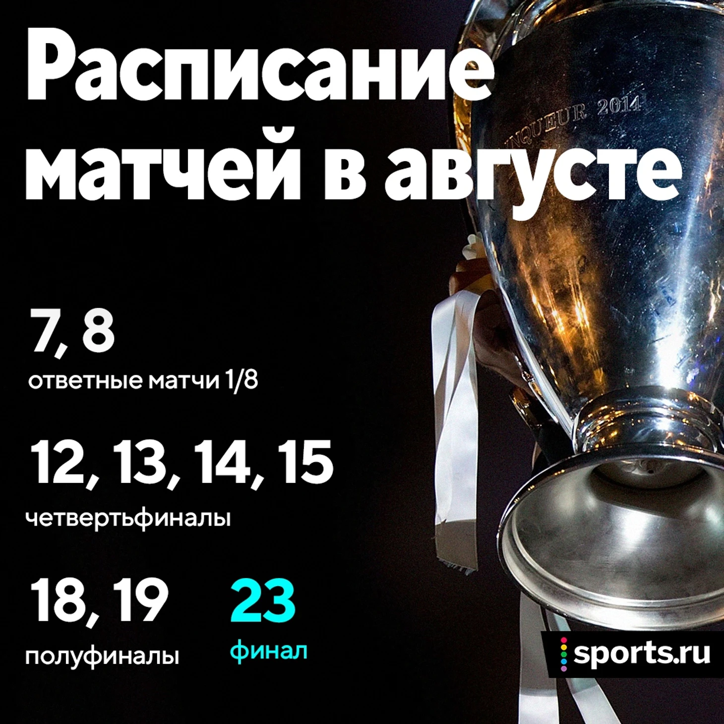 Четвертьфиналы сыграют с 12 по 15 августа, полуфиналы – 18-19 августа. Финал пройдет 23 августа. Все матчи начнутся в 22:00 по московскому времени.