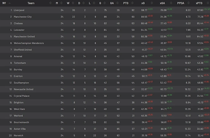 Но даже без этого пенальти «Манчестер Юнайтед» отлично раскатывал позиционные атаки, одна из которых привела к очередному голу Гринвуда, а во втором тайме наконец-таки свой первый гол в этом сезоне забил Поль Погба (конечно же, после передачи Бруну Фернандеша). 2.87 xG против 0.60 у «Астон Виллы» — тотальное преимущество «МЮ» по моментам, которое логично конвертировалось в разгромную победу. Еще были сэйвы Рейны, удар Марсьяля в перекладину и промах Уан-Биссаки из убойной позиции. В последних четырех турах «МЮ» одержал четыре победы с общим счетом 14:2 — до «Лестера» осталось всего очко.
