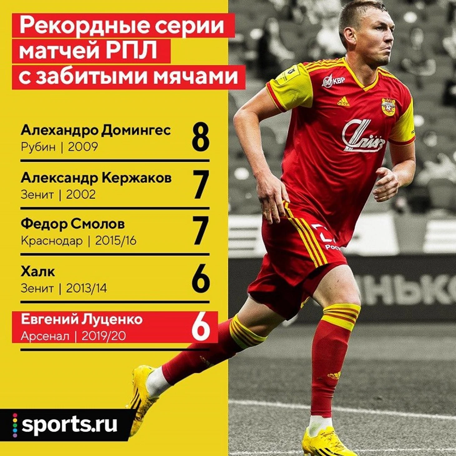 • Это 15-й гол форварда в РПЛ – Евгений отстает от Дзюбы на 1 мяч. Луценко забивает в 6-м туре подряд – то есть во всех играх после рестарта! У Евгения еще 2 матча в этом чемпионате, чтобы догнать Алехандро Домингеса – в «Рубине» тот забивал 8 игр подряд.