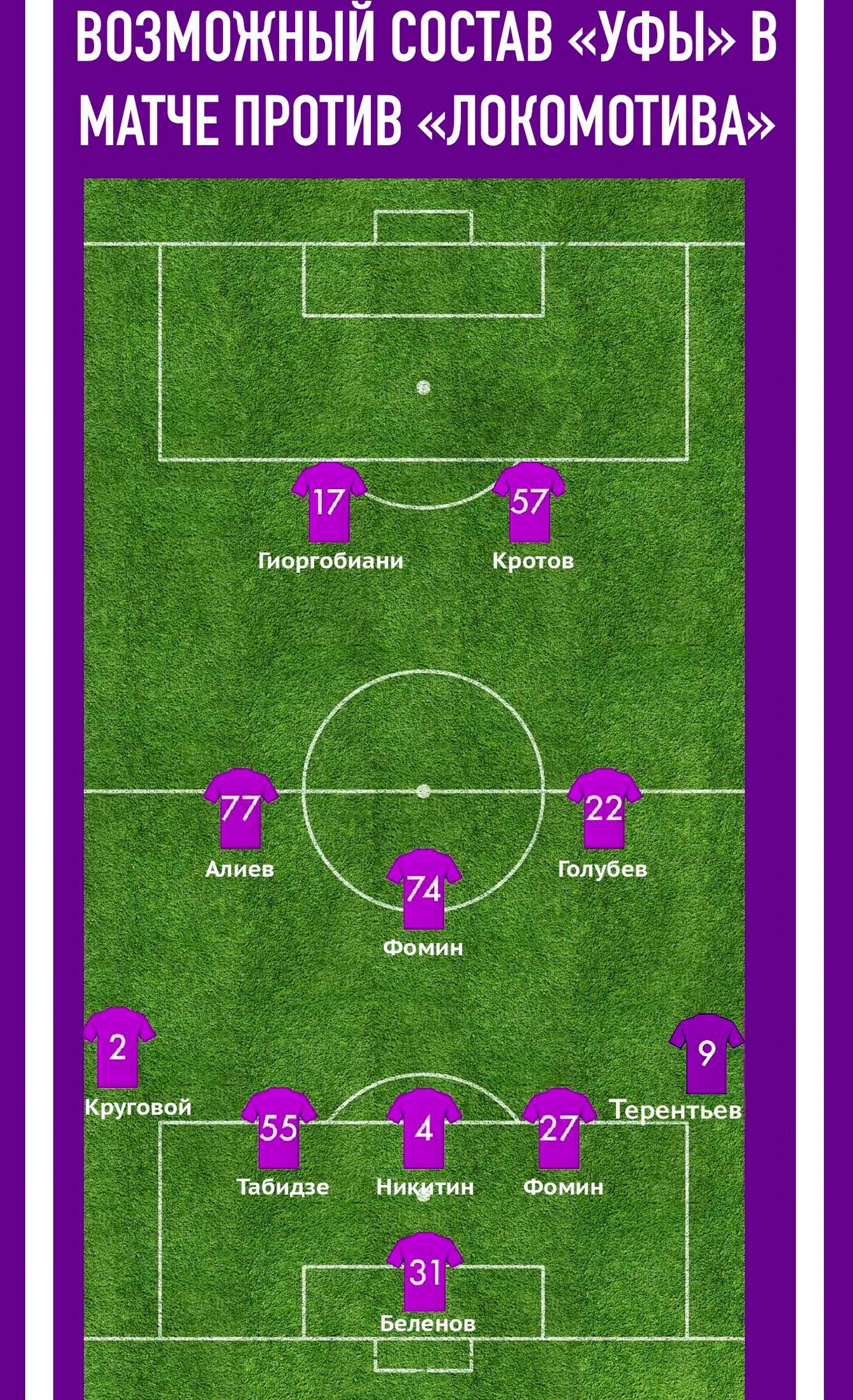 Считаю, что изменения в последней трети поля будут, ибо Гамид Агаларов, начинавший играть против "Ростова" с первых минут, откровенно провалился, что можно списать на то, что молодой игрок ещё не освоился в команде; место нападающего родом из Дагестана займёт Вячеслав Кротов, забивший единственный мяч "Уфы" с игры в матче против ростовской команды. Бок о бок с воспитанником "Спартака", Кротовым, полагаю, выйдет Гиоргобиани, заслуживший такую честь своим хорошим выступлением всё в той же игре (6.9 оценка WhoScored, 4 обводки (100% успешности), 2 выигранные борьбы в воздухе, 3 ключевые передачи, регулярно удивлял своим дриблингом)