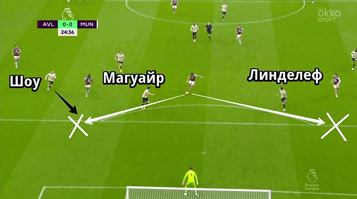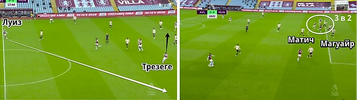 Шоу очень неаккуратно отпасовал назад Давиду, который сыграл уверенно и справился с тяжелым мячом, избежав проблем. Магуайр вполне мог перевести на Биссаку, зону которого покинул Трезеге, или отдать более удобный пас под рабочую ногу Люку, под прессингом такие вещи бывают крайне важны.