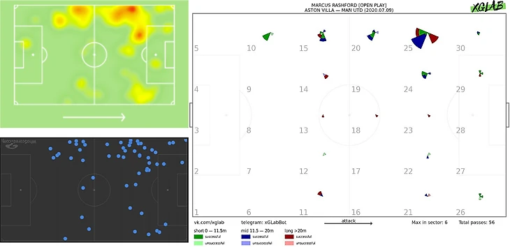 Опять же у Маркуса высокая точность передач (87%), но пока ещё недостает обостряющих среди них. Да, был классный голевой перевод на Ван-Биссаку (кстати, единственный Ключевой пас Рэшфорда в матче), и передача на Бруно в зону 29 в самом начале игры, но Маркус способен на большее!