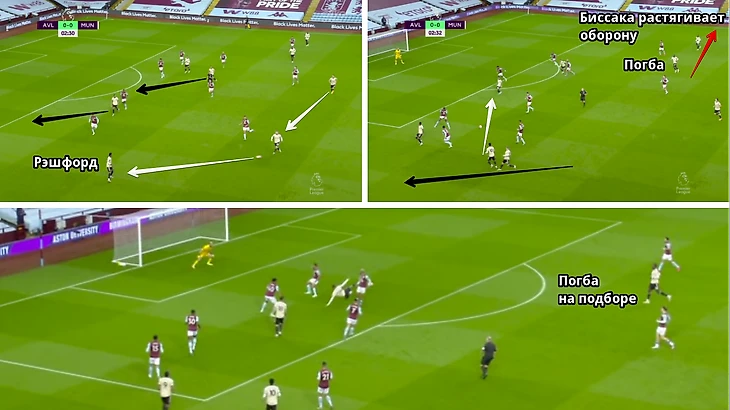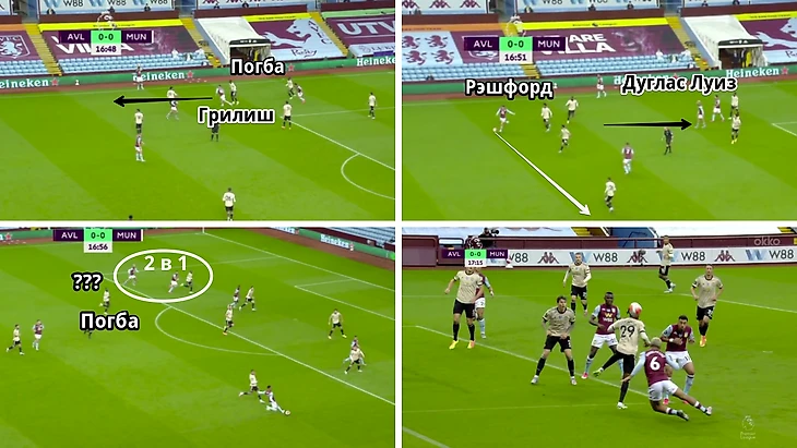 Вот только на 17-ой минуте на Поля нашло затмение. Астон Вилла играла в этом матче по интересной формации 4-4-1-1, где Грилиш в роли свободного художника перемещался с фланга на фланг и менялся позициями с игроками четверки полузащиты. После аута Джек уводит за собой Погба, который должен был просто оставить его на Рэшфорда. В это время Дуглас Луиз подключился в зону Ван-Биссаки: