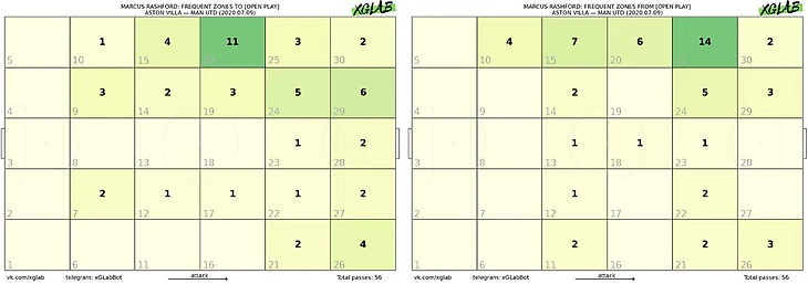 (Cлева — в какие зоны Рэшфорд пасует, справа — из каких зон Рэшфорд пасует.)