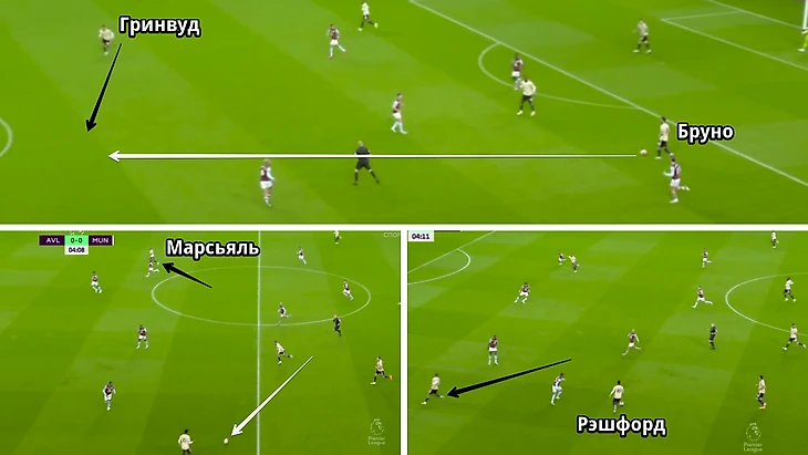 После аута на правом фланге мяч переводится на противоположный край поля. Марсьяль забегает под Рэшфорда, Бруно устремляется в зону, которую покинул Антони: