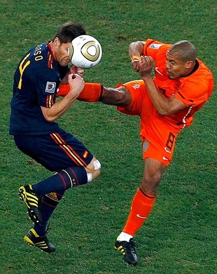 Чем же запомнился тот финал? Отвратительно грубой, грязной и жесткой игрой от всей голландской сборной, все игроки от Ван Перси и до Ван Бронхорста постоянно очень грубо нарушали правила, удар Де Йонга по Хаби Алонсо вообще был из восточных единоборств. Говард Уэбб не стал портить финал, показав лишь желтую за этот прием. Нидерланды пытались играть как "Интер" Моуриньо против "Барсы" в полуфинале ЛЧ, но даже автобусные сине-черные сфолили за 90 минут лишь 12 раз, у подопечных Ван Марвейка за первый тайм - 10 .Если бы Роббен забил свой момент, который кстати случился лишь из - за того, что Пике не успел занять место в центре защиты (до этого покинул поле по причине удара локтем от Кёйта), то скорее всего они бы стали чемпионами мира, не показывая чемпионской игры.