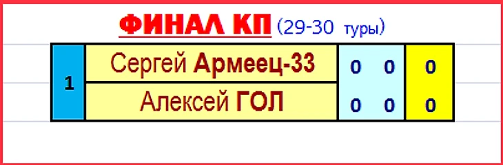В паре №2 еще сложнее... тут и доп.время ничего не дало в определении победителя - и 1 и 2 игра закончились с одинаковым счетом... читаем регламент дальше - "...если и тут равенство, то тот участник, который выше в таблице чемпионата КР...". Смотрим таблицу после этого тура (выше картинка) - и тут равенство - оба игрока набрали по 347 очков после 28 тура... ???... Но и в таком случае нам уже за эти 8 сезонов пару раз приходилось определять даже итоговое Чемпионство... и тогда выше место было у того, у кого большее кол-во угаданных прогнозов (УП) за сезон... смотрим в таблицу Лиги РА и видим - у Алексея ГОЛ - 98, а у Максима Rayz - 97... вот так лишь последний послематчевый пенальти и не позволил Максиму выйти 2 год подряд в финал Кубка КП... Это был достойный полуфинал!!!