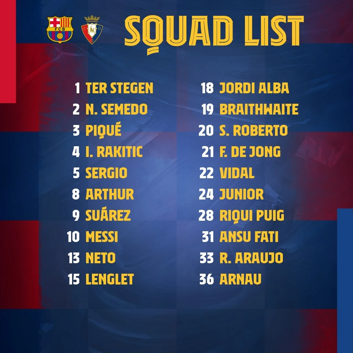 Официальный Twitter-аккаунт «Барселоны» опубликовал полную заявку на 20 футболистов (в связи с коронавирусной ситуацией финальная заявка может включать 23 игрока).