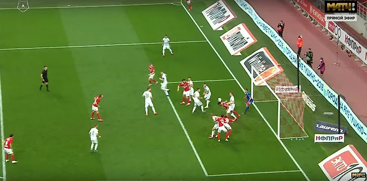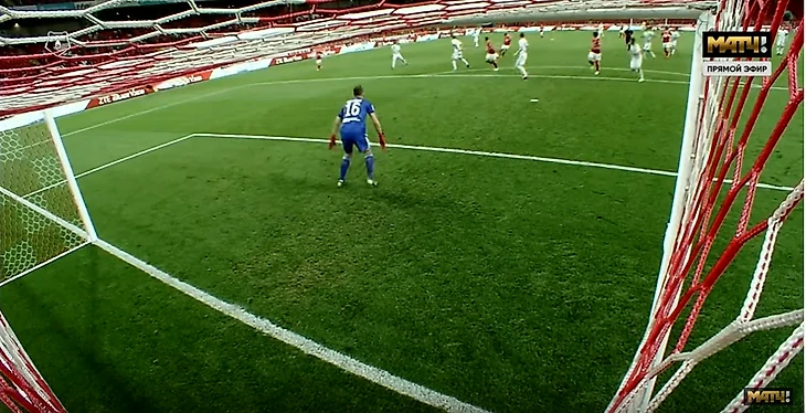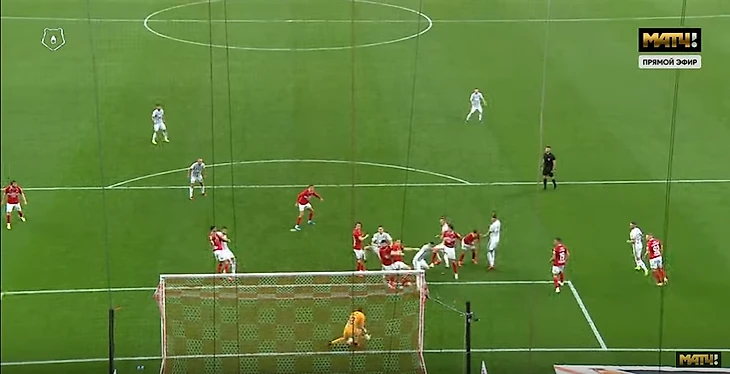 Первый гол "Спартака" пришел оттуда, откуда его меньше всего ждали. Роман Зобнин получил мяч от Маслова, решился на удар с двадцати метров и не ошибся. 5 гол "красно-белых" из-за пределов штрафной в этом сезоне.