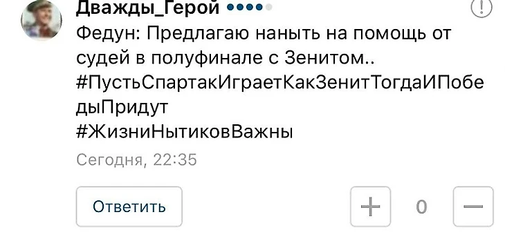 После победы над «Ахматом» (3:0) Леонид Федун говорил не только о победе, но и о судьях и «Зените»: «Я сказал ребятам, что так и нужно отвечать на судейские дела. Предлагаю сделать хэштег #СудитеСпартакКакЗенит, тогда мы будем чемпионами».