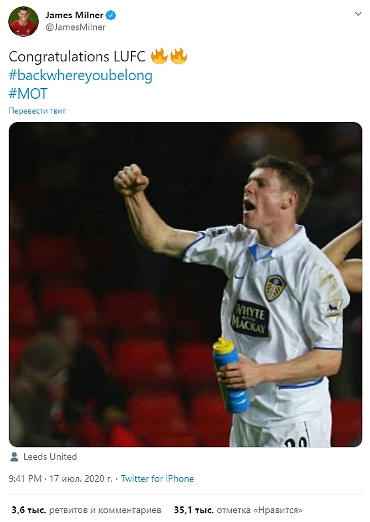 Джеймс, кстати, одним из первых поздравил «Лидс» с возвращением: