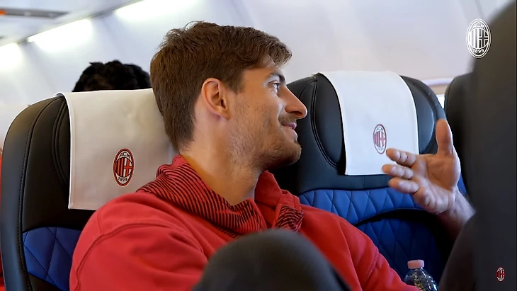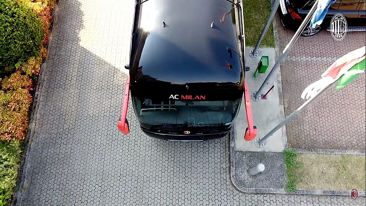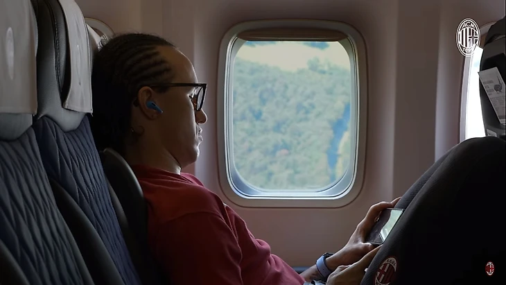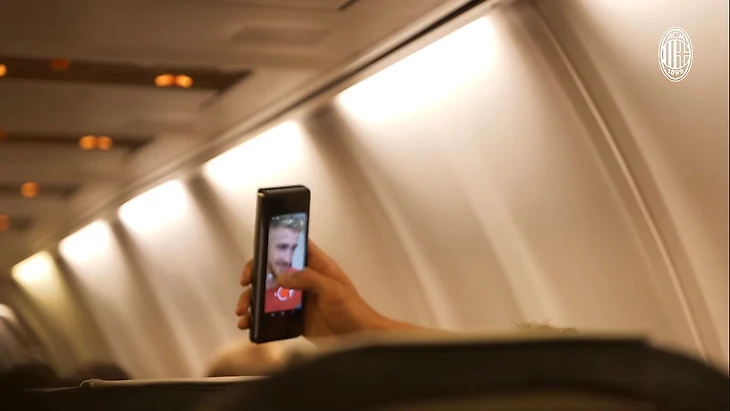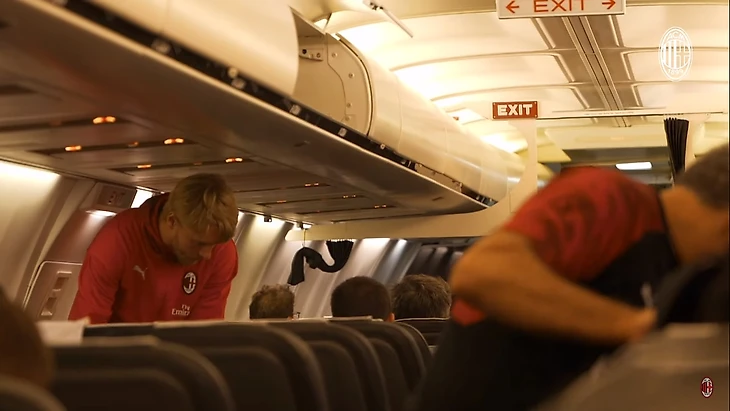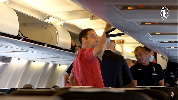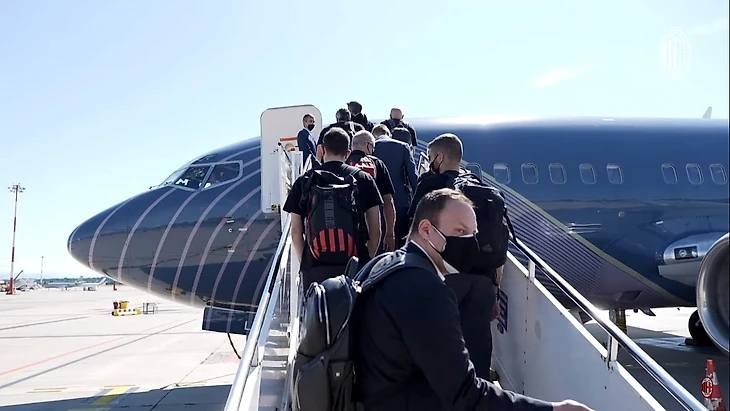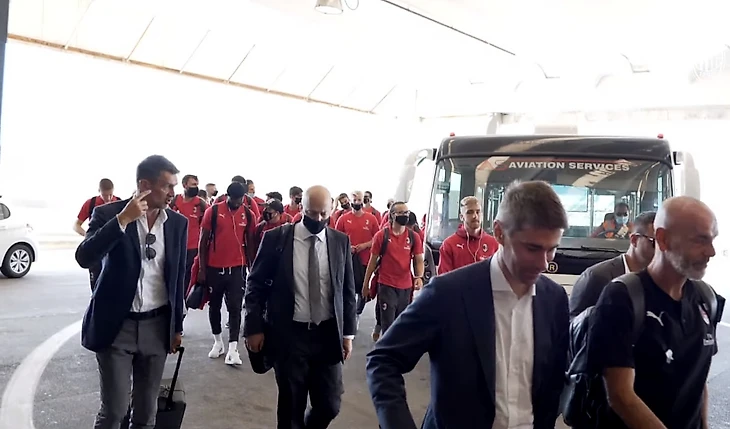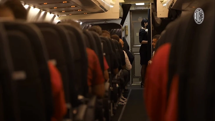 Команда выходит из самолета, пересаживается на автобус, который забирает их со взлетно-посадочной полосы и отвозит непосредственно к аэропорту. На кадрах впервые замечаем руководство клуба - Паоло Мальдини, Иван Газидис и Фредерик Массара прилетели в столицу вместе с парнями. Также впервые в кадре появляется главный тренер "Милана" Стефано Пиоли.