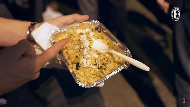 Джанлуиджи Доннарумма показывает в камеру, чем же ужинают победители - это самый обычный вареный рис с овощами и какой-то заправкой белого цвета (надеюсь, не майонез). И заметьте, парни едят не золотыми вилками, а простецкими пластиковыми ложками.
