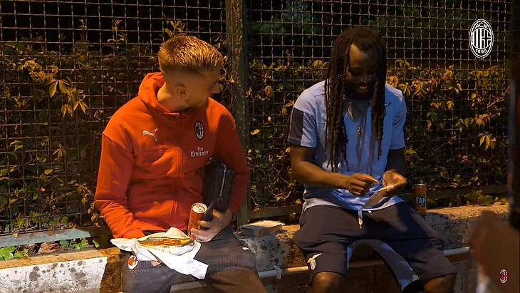К трапезе "дьяволов" присоединяется защитник "Лацио" Джордан Лукаку. Он и Салемакерс позволяют себе пропустить по баночке содовой.