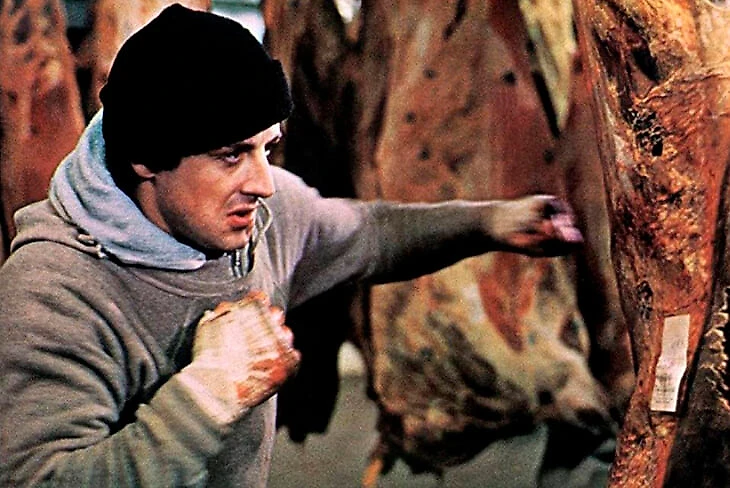 Одна из самых культовых сцен всей франшизы – как Рокки молотит мясные туши в холодильной камере. И да, он снова в худи.