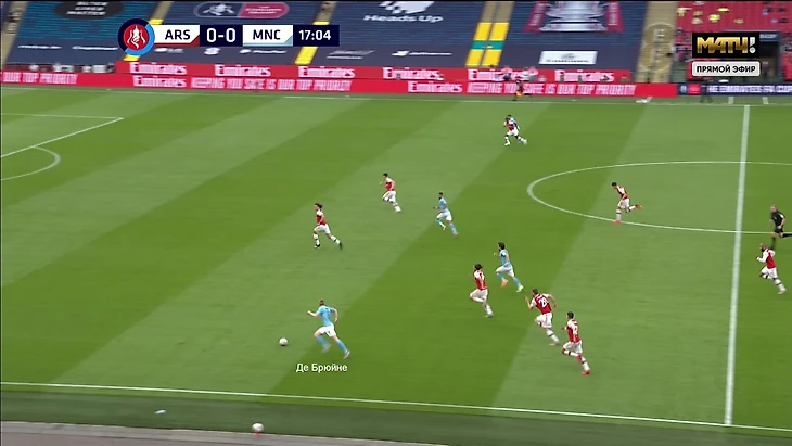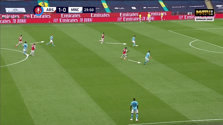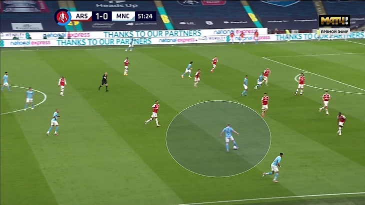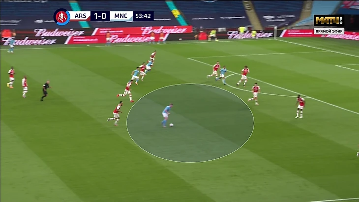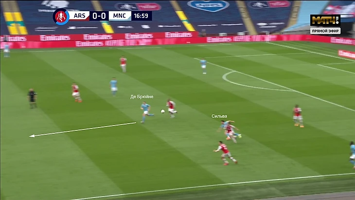Например, в этом эпизоде прессинг «Арсенала» развалился. Давид Сильва опустился и сохранил мяч в трудной ситуации, а КДБ сделал резкий рывок вперед (игравший с ним Ляказетт до конца не побежал):