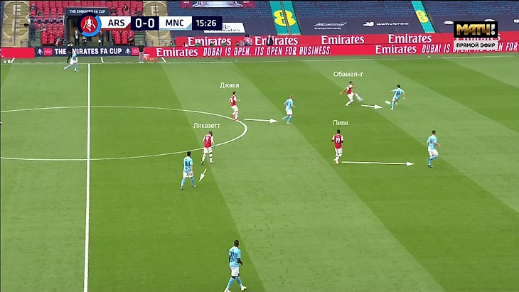 5. Давление «Арсенала» здорово подходило для игры против «Сити», который не был готов к этому. Вероятно, ждали более традиционный для этой схемы вариант, где Ляказетт не опускается за Гюндоганом, а один давит на двух центральных защитников (Обамеянг и Пепе, следовательно, располагаются глубже).