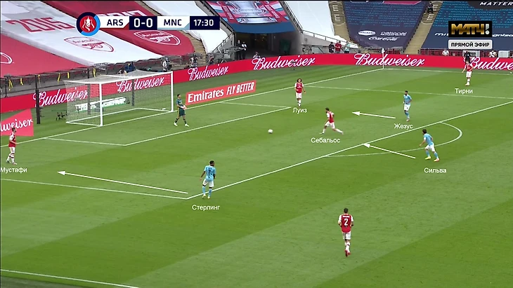 6. Артета удивил Гвардиолу и в стадии розыгрыша мяча (именно прессинг и розыгрыш Пеп считает самыми важными при анализе соперника). Схема «Арсенала» трансформировалась. Киран Тирни (центральный защитник по стартовой схеме) при розыгрышах уходил на левый фланг. В центре защиты оставались только Мустафи и Давид Луиз. Джака и Себальос поочередно опускались в штрафную, Мартинес терпеливо исполнял короткие передачи: