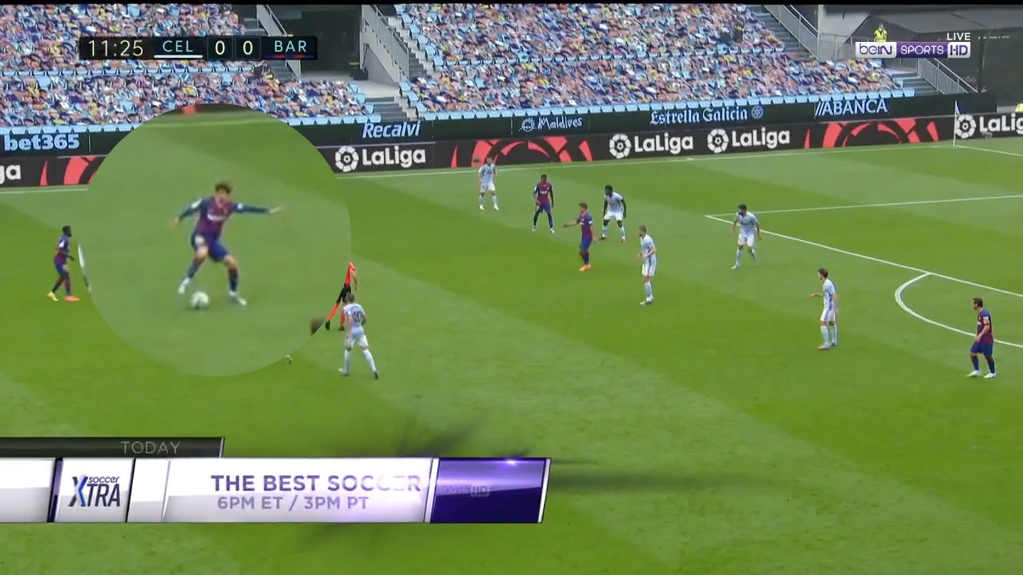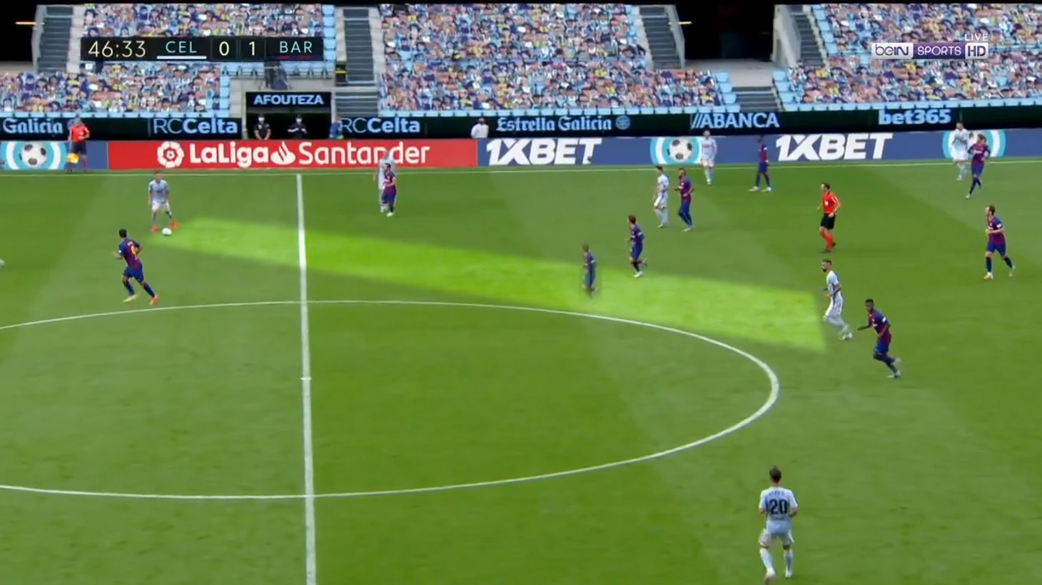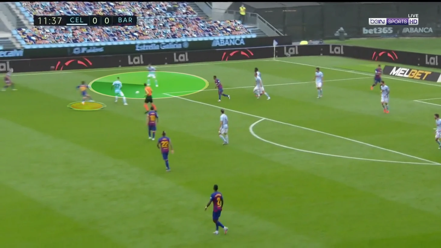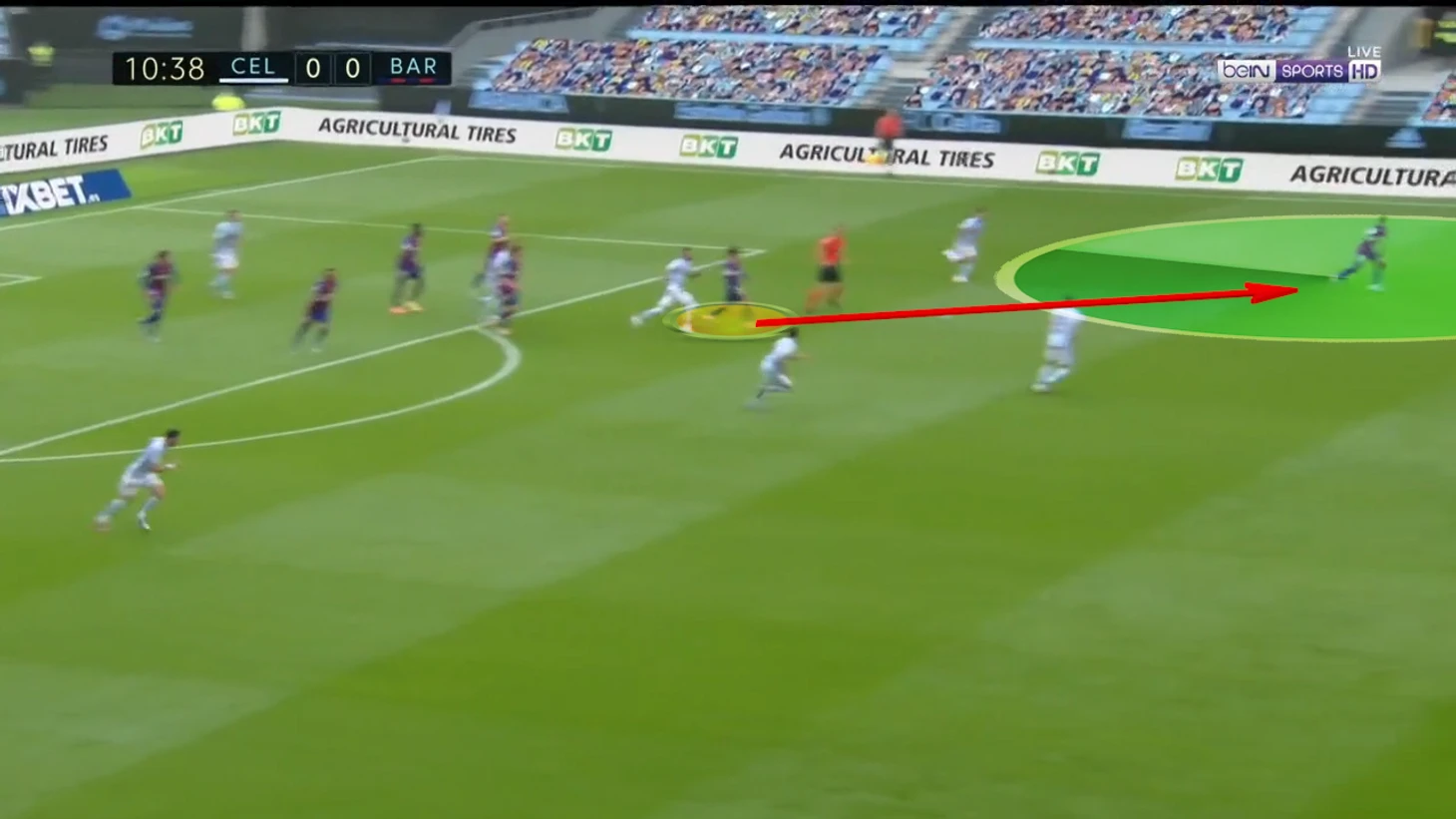 И здесь вспоминаем про непрерывность. Рики всегда играет до конца: дисциплинированно возвращается в оборону (вернулся и перехватил мяч в матче против «Сельты»), поддерживает прессинг команды. Например, когда один Ракитич выдвигается на соперника, но вблизи Рики есть свободный игрок, он резко его накрывает.