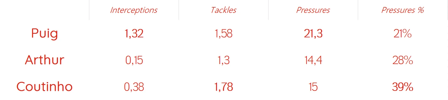 Вспоминаем о перехватах: Рики делает почти в 9 раз больше перехватов (interceptions) на 90 минут, чем Артур, и в три раза больше, чем Коутиньо. Все это помогает чаще и выше возвращать владение. Также надо обратить внимание на прессинг-действия (pressures).