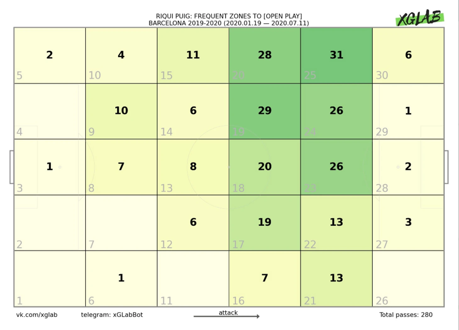 Теперь о цифрах. Вот карты откуда (from) и куда (to) делал передачи Пуч в чемпионате-2019/20: