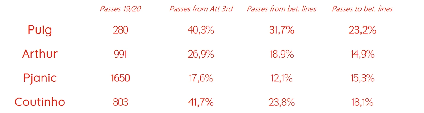 На лидерство Коутиньо в передачах, сделанных в атакующей трети, нужно смотреть немного с опаской: во-первых, в «Баварии» бразилец играл на позиции атакующего полузащитника, а не инсайда; во-вторых, процент касаний игроков «Баварии» в атакующей трети – 34, когда в каталонской команде немного меньше – 30, то есть немецкая просто располагается повыше. Похожая ситуация c Пьяничем – Миралем зачастую выходил глубже, нежели его конкуренты по таблице. Босниец – единственный, у кого процент to больше, чем from.
