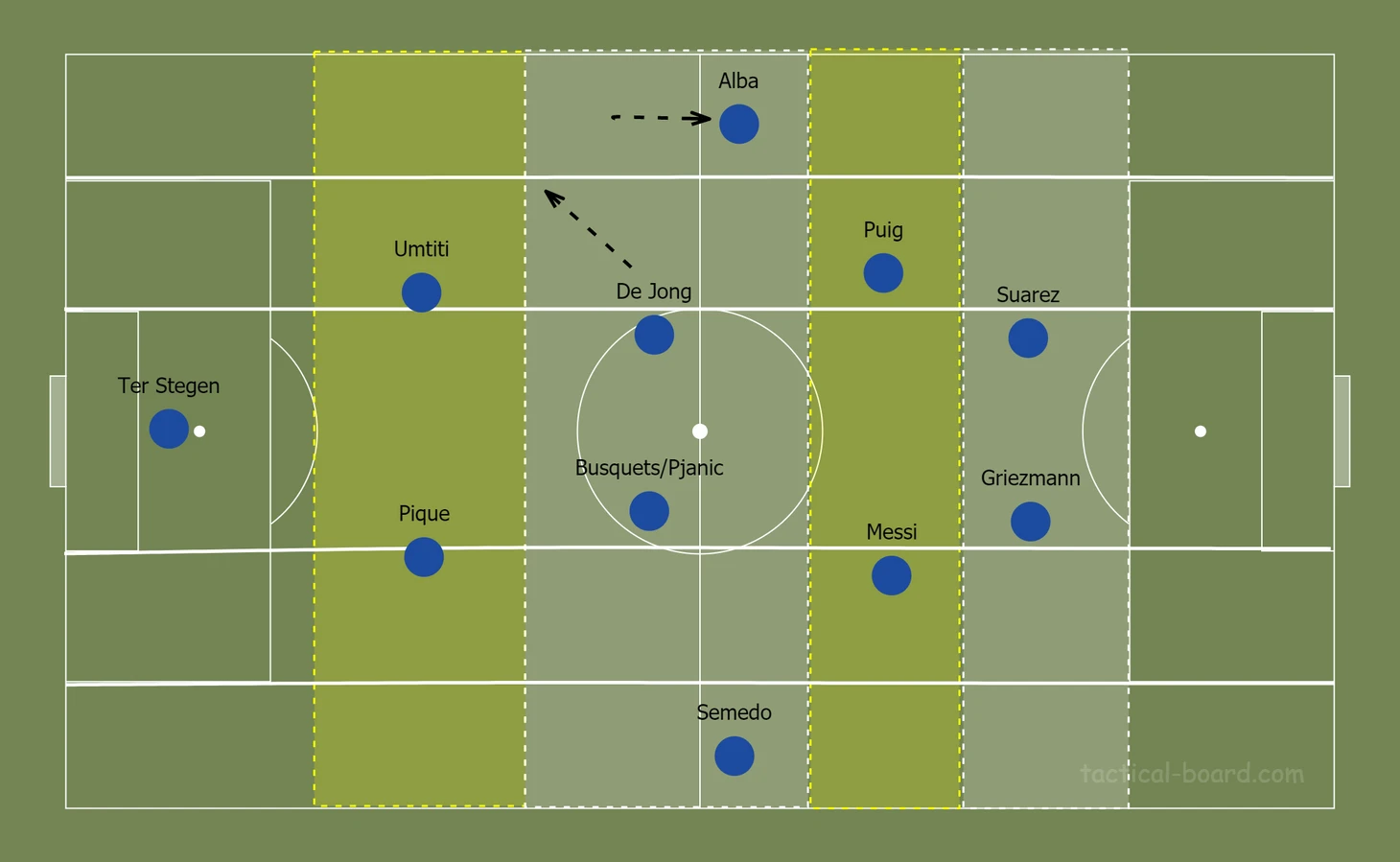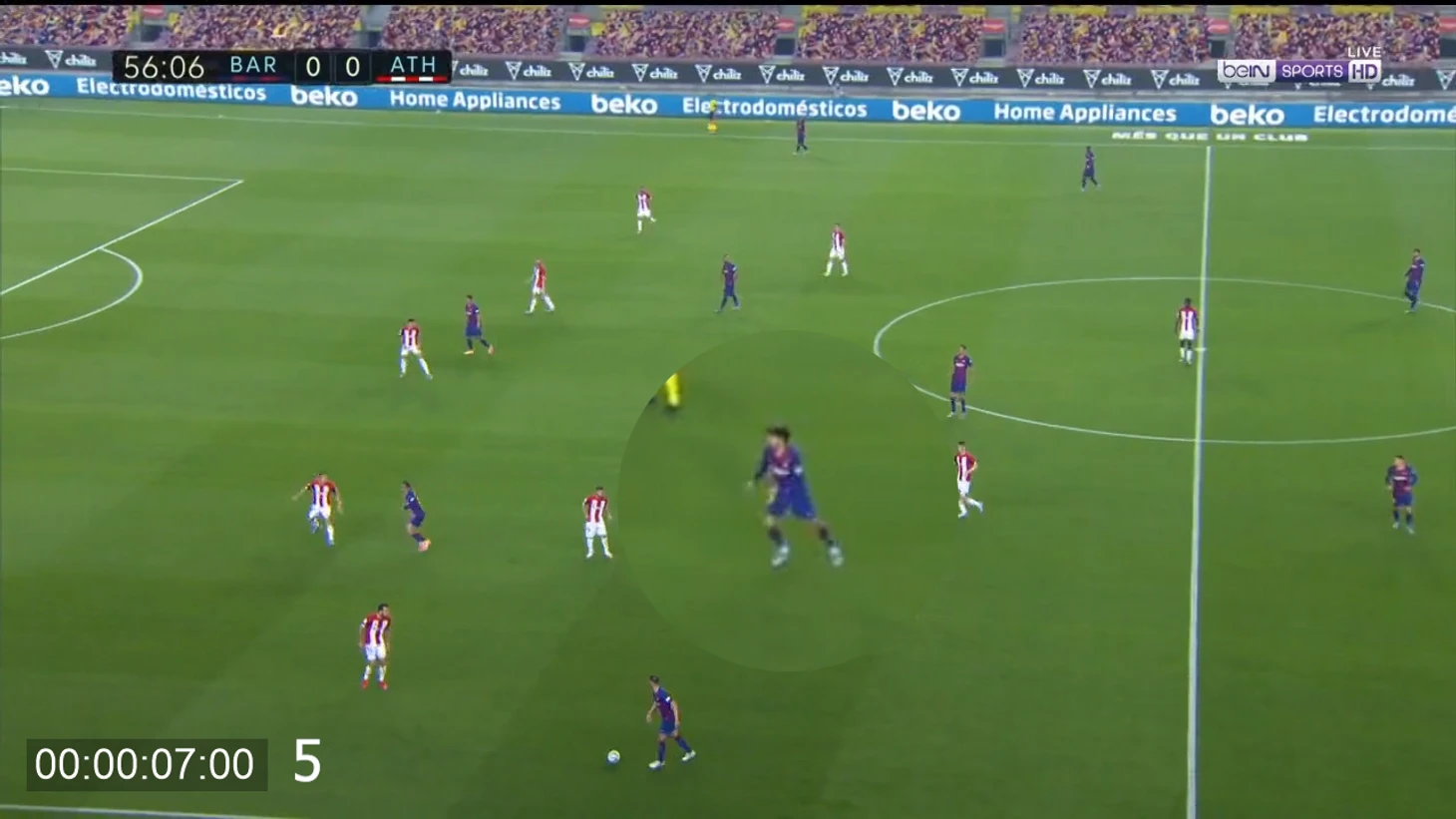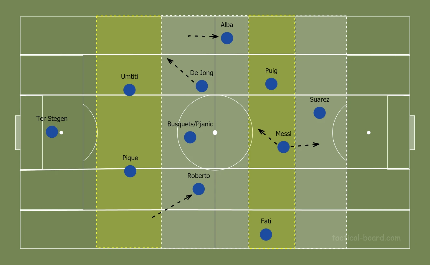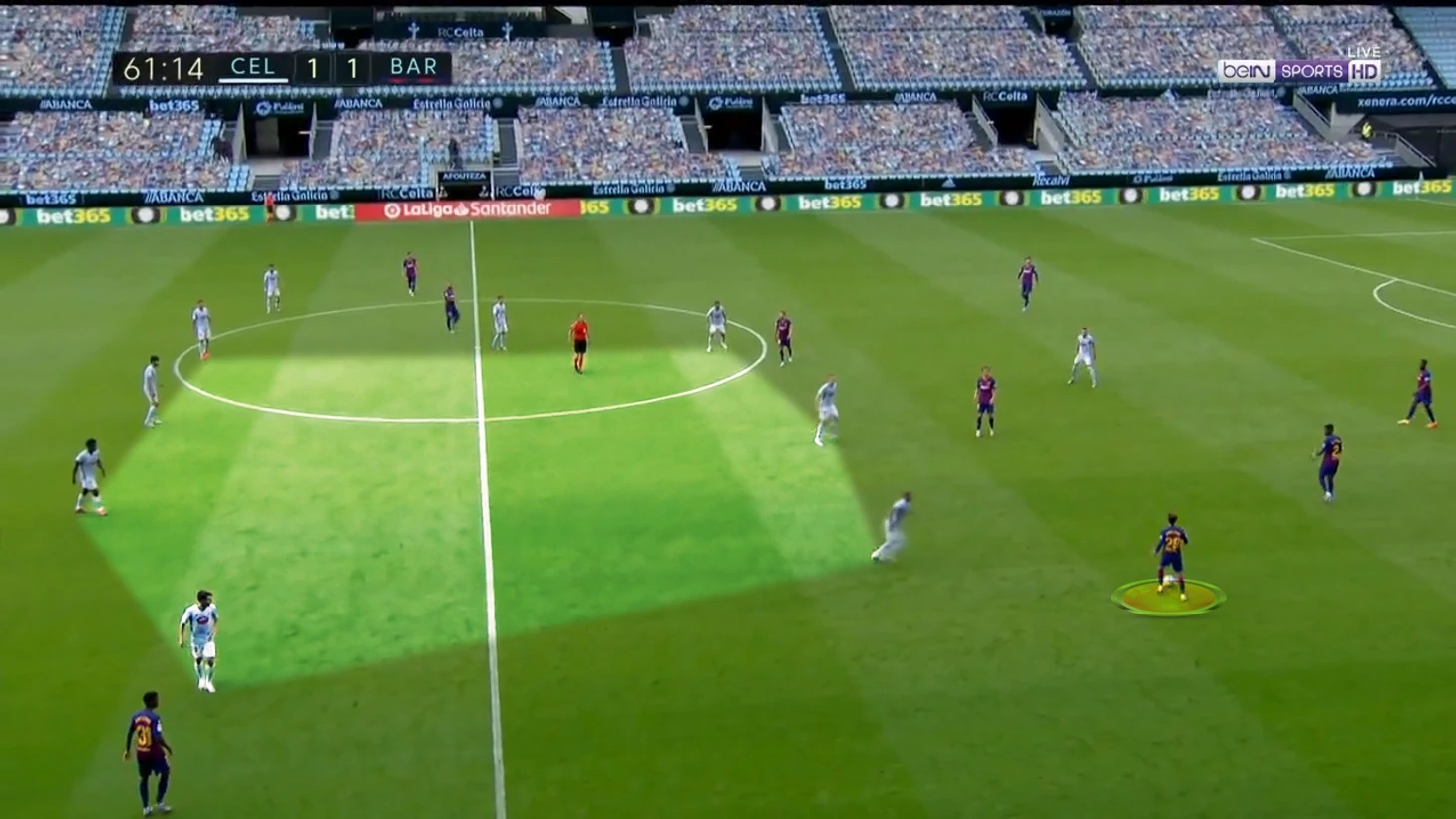 Возвращаясь к теме опусканий Месси. Часто возникают ситуации, когда Месси опускается, а тройка полузащитников играет в позиции, то есть никто не заполняет пространство между линиями, куда Месси с его уровнем технического и тактического мастерства вполне бы мог отдать. Нужно отметить, что и полузащитники «Барсы» не совсем такого профиля, чтобы врываться из глубины (разве что Видаль, но здесь стоит вспомнить об игре на ограниченных пространствах и под давлением, с чем у чилийца не все хорошо).