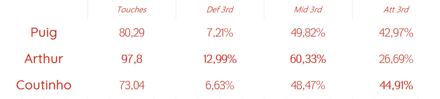 После получение передачи Пуч предпочитает отдать пас, продолжить атаку, нежели попытаться обвести соперника. Этому есть объяснение: зачастую он принимает мяч уже в последней трети (42,97% касаний), где меньше пространства-времени для взвешенной попытки отрезать соперника с помощью дриблинга, а обводки ради обводок Рики не интересны (смотрим процент удачных обводок). Здесь и дальше на статистику смотрим с опаской: дистанция показателей Рики очень небольшая (338 минуты), в Артура ситуация похожая, но у него другие причины отсутствия игрового времени (1179 минут), ну а Филиппе просто проводит сезон в другой команде и лиге.