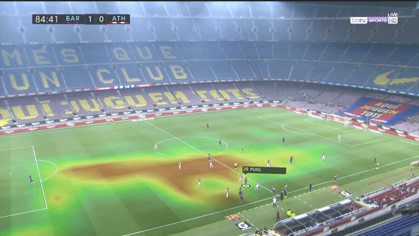 Вот тепловая карта Пуча против «Атлетика», которая подтверждает описанное выше. Рики опускается для поддержки опорника при билд-апе, при позиционных атаках располагается в левом полуфланге, а в финальной трети мало подключается в штрафную, контролируя зону «второго» мяча или смещается к Альбе для создания численного большинства на фланге.